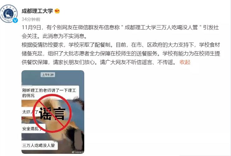对此,成都理工大学于11月9日通过官方微博辟谣称:根据疫情防控要求,学校采取了配餐制。目前,在市、区政府的大力支持下,学校食材储备充足,组织了大批志愿者全力保障在校师生的送餐服务。学校有能力为在校师生提供餐饮保障,请家长朋友们放心。请广大网友不听信谣言、不传谣。(成都网络辟谣微信公号)
