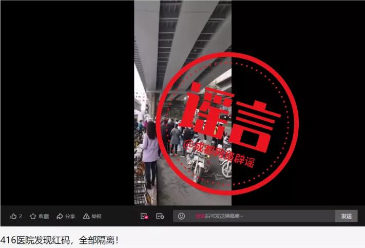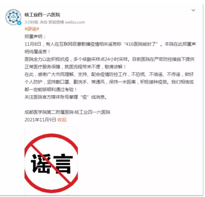 针对网传消息,成都416医院于11月9日通过官方微博辟谣称:11月8日,有人在互联网恶意散播疫情相关谣言称“416医院被封了”。本院在此郑重声明纯属谣言!医院全力以赴积极抗疫,多个核酸采样点24小时采样。目前医院在严密防控措施下提供正常医疗服务保障,就医流程带来不便,敬请谅解。(成都网络辟谣微信公号)