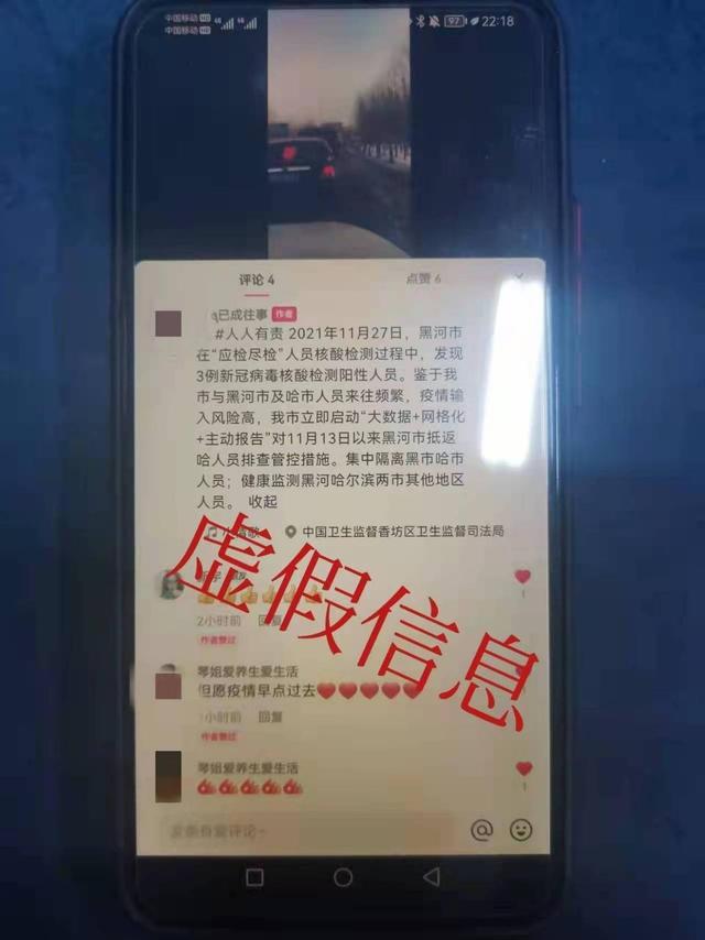 龙江县公安局山泉派出所接到上级推送线索后,立即开展调查取证工作,经核实,信息内容为虚假信息。11月27日晚,民警成功将违法嫌疑人韩某抓获。经询问,韩某如实交代了其虚构疫情信息发布在某视频平台的违法事实。目前,韩某因虚构事实扰乱公共秩序被警方依法行政处罚。