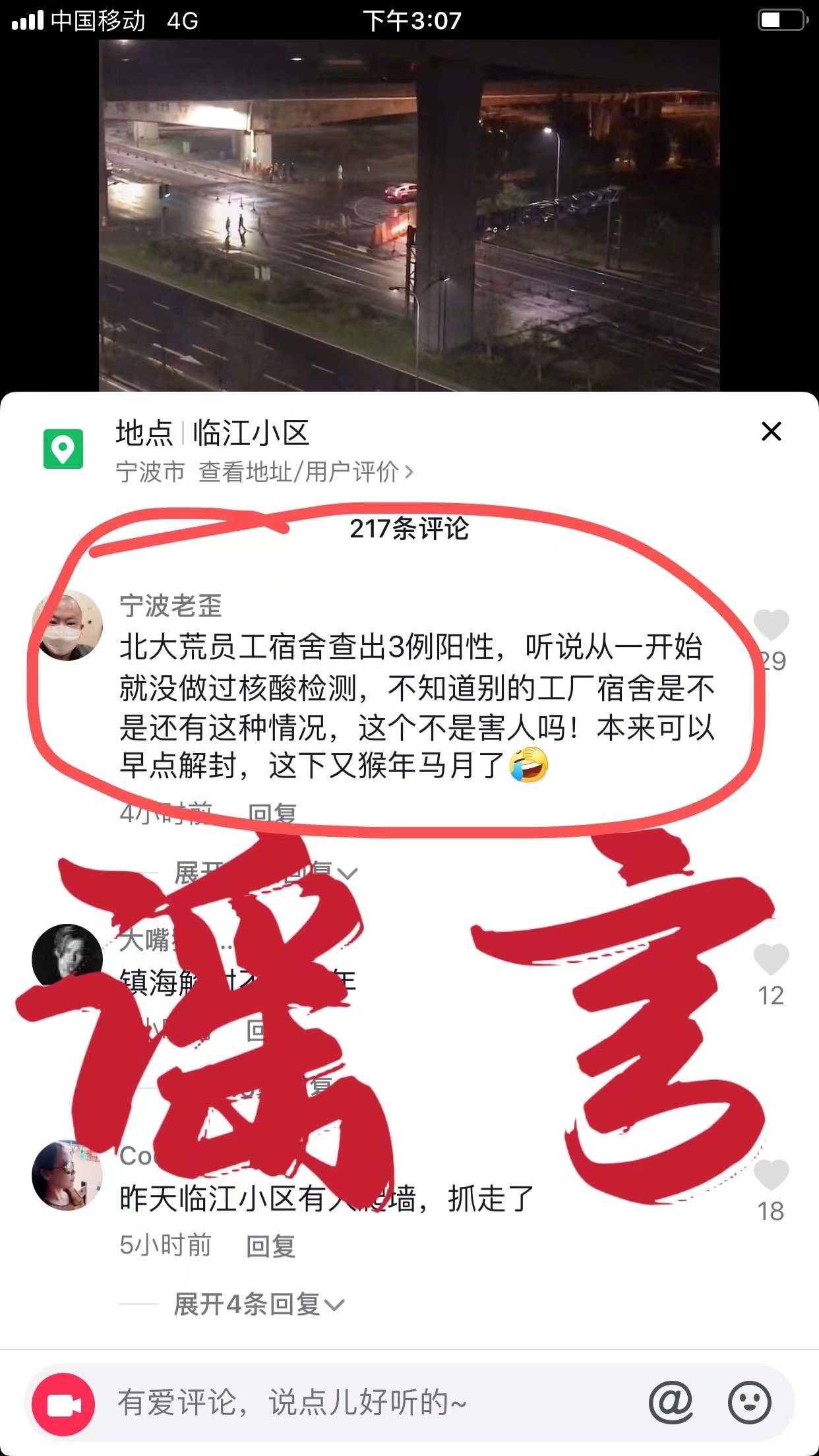 12月16日,有网民发短视频称“宁波镇海区某员工宿舍查出三例阳性病例……”等,经向有关部门核实,为不实信息。