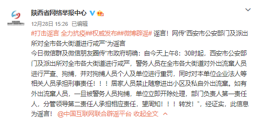 陕西省网络举报中心:“西安市公安部门及派出所对全市各大街道进行戒严”为谣言