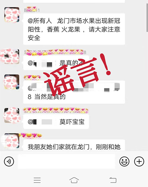 1月11日晚,一张绵阳“龙门市场水果出现阳性”的聊天截图在网络上传播。经绵阳网警核实,截止1月12日9时,绵阳新冠疫情防控指挥部未收到有此消息。