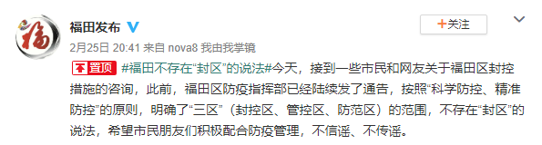 2月25日,接到一些市民和网友关于福田区封控措施的咨询,此前,福田区防疫指挥部已经陆续发了通告,按照“科学防控、精准防控”的原则,明确了“三区”(封控区、管控区、防范区)的范围,不存在“封区”的说法,希望市民朋友们积极配合防疫管理,不信谣、不传谣。