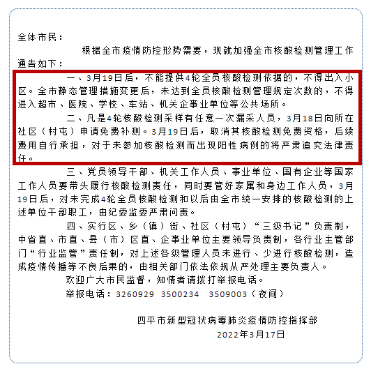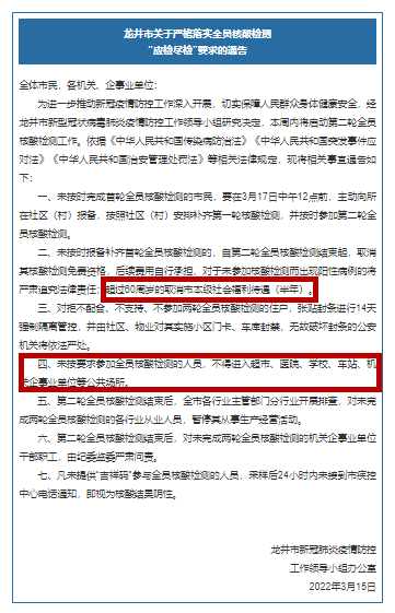 青岛网上辟谣平台搜证发现,在吉林省龙井市和四平市发布的加强全员核酸检测管理工作的通告中,提到了上述相关内容。此外,3月17日深圳市福田区福田街道新型冠状病毒肺炎疫情防控指挥部发出通知称,不配合核酸检测和网格登记的,均在网格采集系统注销信息,由此可能影响社保购买、就学就业等。