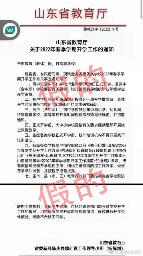近日,微信群流传的《关于2022年春季学期开学工作的通知》(鲁教办字〔2022〕9号)引发网友关注。经核查,山东省教育厅从未发布该文号文件,特此辟谣。