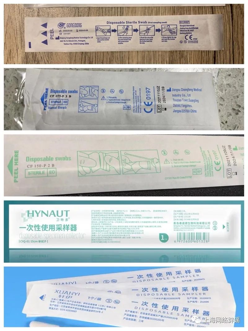 为了进一步了解采样拭子,上海辟谣平台还随机选择了市场上流通的抗原检测试剂盒,看看它们搭配的采样拭子究竟是什么。从收集到的采样拭子看,全部是独立小包装,中文产品名称为“一次性使用采样器”,而不是“棉签”。产品包装上均有医疗器械备案证信息。