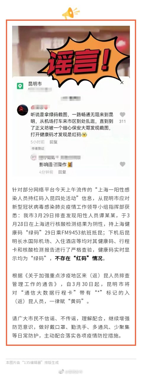 据@昆明发布 消息,针对部分网络平台30日上午流传的“上海一阳性感染人员持红码入昆四处活动”信息,从昆明市应对新型冠状病毒感染肺炎疫情工作领导小组指挥部获悉:昆明市3月29日排查发现阳性人员谭某某,于3月28日在上海进行核酸检测结果为阴性,持上海健康码“绿码”29日乘FM9453航班抵昆;下机后昆明长水国际机场、入住酒店等均对其健康码、行程卡和核酸检测报告进行了严格查验,健康码实时显示均为“绿码”,不存在“红码”情况。