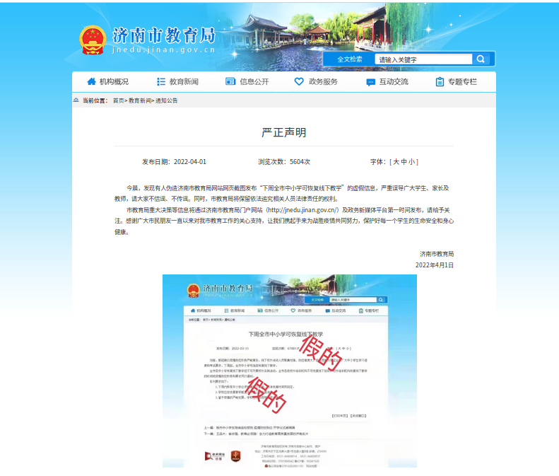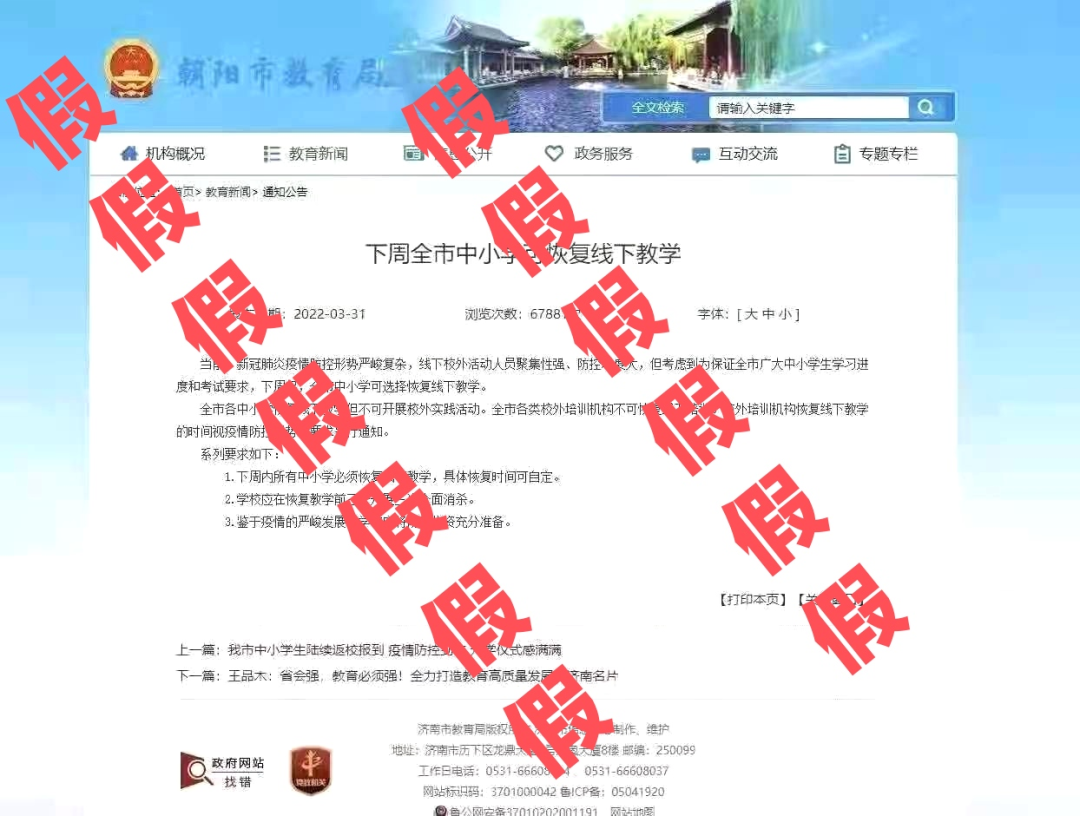 同时,朝阳市网信办发现,此信息最初为伪造济南市教育局网站网页截图进行发布,济南市教育局官网已于今日对虚假信息进行了辟谣。