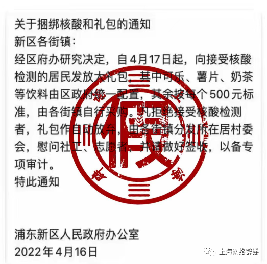 近日,圈群流传一条“关于捆绑核酸和礼包的通知”消息,称浦东新区人民政府将向接受核酸检测的居民发放大礼包。消息中提到,礼包为500元标准,包含可乐、薯片、奶茶等,拒绝接受核酸检测着将视为自动放弃礼包。
