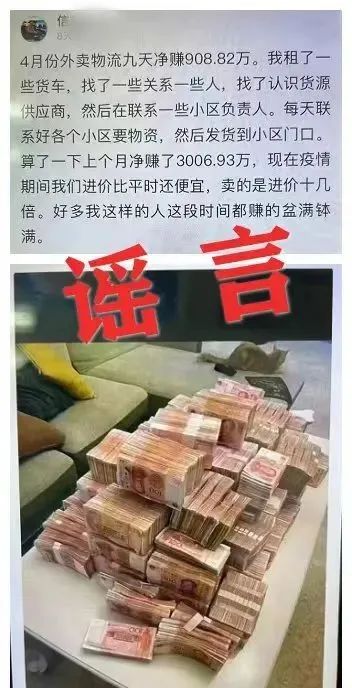 4月23日,“警民直通车上海”发布警情通告:近日,一篇所谓“个人利用疫情高价倒卖物资,一个月获利上千万”的帖子在网络流传。经警方调查,信某(男,32岁)疫情期间封控在家,为博取眼球、吸引关注,于2022年4月10日在网上虚构了自己“在疫情期间租用货车,高价倒卖物资,仅九天净赚人民币908.82万元,3月份赚了人民币3006.93万元”等不实言论,并配了一张从网上下载的桌上堆满人民币的照片,引起网民大量关注,产生不良社会影响。目前,信某因虚构事实扰乱社会秩序被闵行警方依法行政处罚。
