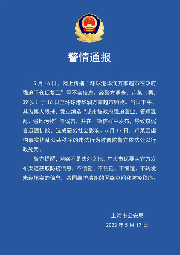 上海市公安局通报,5月16日,网上传播“环球港华润万家超市在政府强迫下仓促复工”等不实信息。经警方调查,卢某(男,39岁)于16日至环球港华润万家超市购物。当日下午,其为博人眼球,凭空编造“超市被政府强迫营业,管理混乱、遍地污物”等谣言,并在一微信群中发布,导致该谣言迅速扩散,造成恶劣社会影响。5月17日,卢某因虚构事实扰乱公共秩序的违法行为被普陀警方依法处以行政处罚。