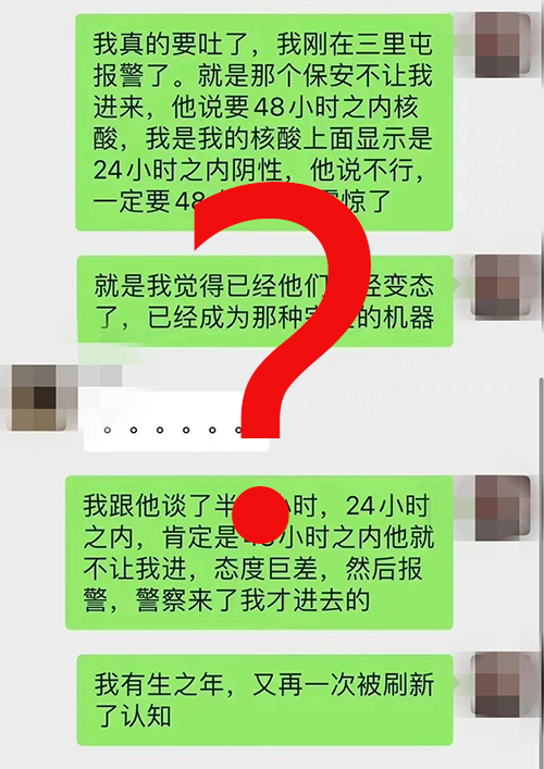5月31日,一位网友在网上发布信息称,北京三里屯有保安坚持要求其出示48小时内核酸证明,对24小时内的核酸证明并不认可,她当场报警。