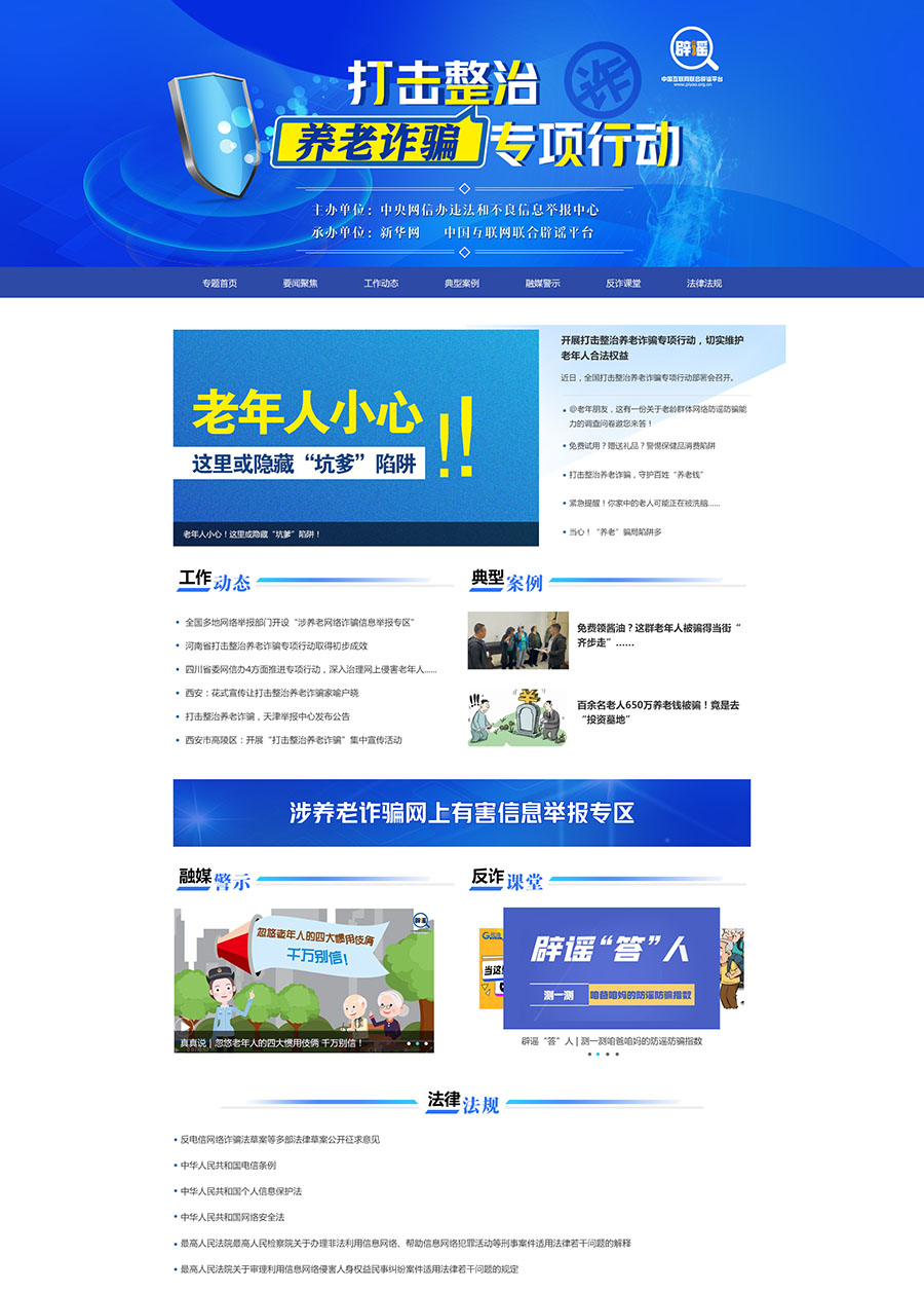 近日,中国互联网联合辟谣平台“打击整治养老诈骗专项行动”专题正式上线。
