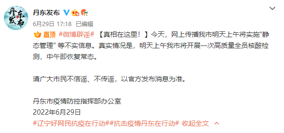 网传丹东6月30日上午将实施“静态管理” ?不实!