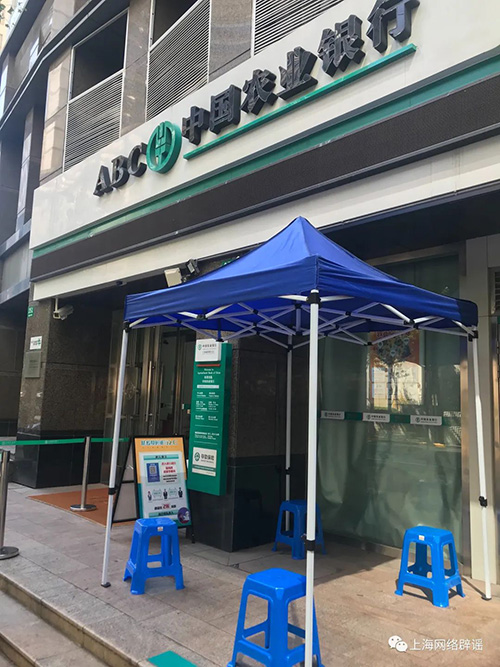 中国农业银行某网点为等候人群设立帐篷和座椅