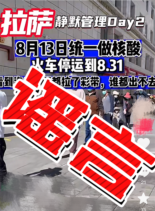 某网民在短视频平台传播“拉萨静默管理Day2,8月13日统一做核酸,火车停运到8月31日”的信息,经与青藏集团公司拉萨铁路办事处核实,该网传信息不实。