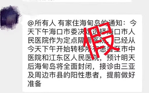 网传“明天(16日)后海甸岛将全面封闭”为不实消息。请广大市民关注官方权威信息,不造谣、不信谣、不传谣,按疫情防控要求积极做好个人防护,有序参加核酸检测,自觉履行自身防疫责任。对恶意传播不实信息的,将依法追究责任。