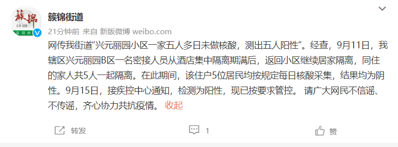 近日,成都市武侯区簇锦街道办事处微博发布信息称,网传我街道“兴元丽园小区一家五人多日未做核酸,测出五人阳性”。经查,9月11日,我辖区兴元丽园B区一名密接人员从酒店集中隔离期满后,返回小区继续居家隔离,同住的家人共5人一起隔离。在此期间,该住户5位居民均按规定每日核酸采集,结果均为阴性。9月15日,接疾控中心通知,检测为阳性,现已按要求管控。 请广大网民不信谣、不传谣,齐心协力共抗疫情。