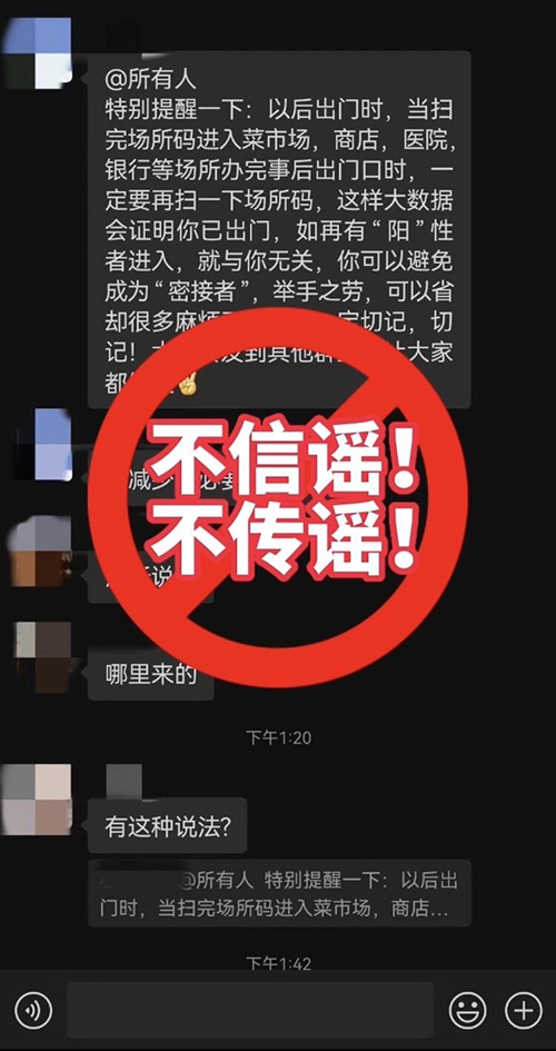 近日,在微信群里流传着一种说法:“进入农贸市场、商超、医院、银行办完事出门的时候,再扫一下场所码,这样,大数据就会证明你已出门,如果再有阳性病例进入,就与你无关,可以避免成为密接者,大家一定要转发!”