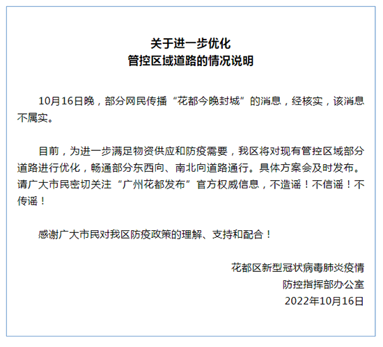 10月16日晚,部分网民传播“花都今晚封城”的消息,经核实,该消息不属实。