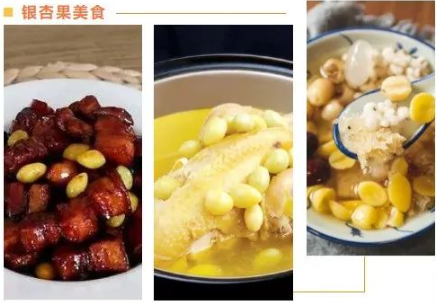 白果做法多样,既可做菜,如白果红烧肉、白果炖鸡、银耳白果甜汤等。也可以做粥,还可直接炒制后作为零食。银杏果富含支链淀粉,炒制后应趁热食用,口感软糯,冷却后口感发硬。