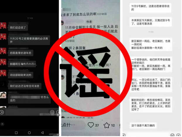 接网民举报,近日有网民在微信群组、微博、小红书等平台以图片、文字等形式散布“11月5日解封,一段时间后继续封控”等虚假信息及类似变种样本,经与相关部门核实查证,上述信息为网络谣言。