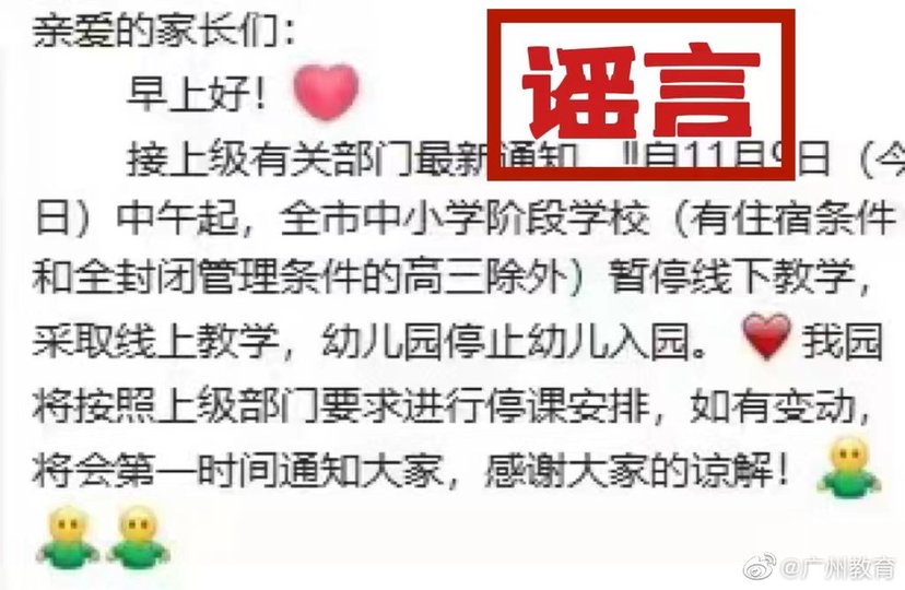 广州市教育局:网传全市中小学停止线下教学、幼儿园停止入园系谣言