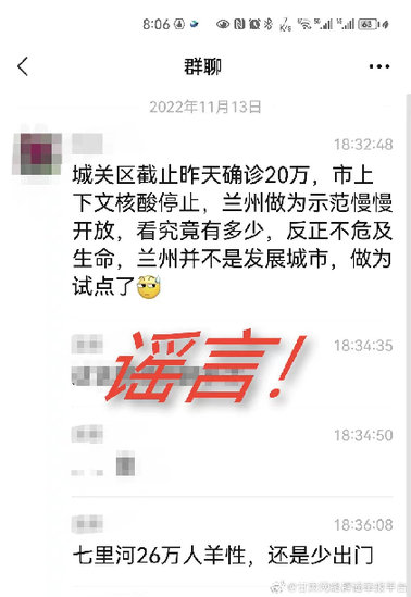 近日,部分微信群圈里传播的甘肃兰州“城关区截止昨天确诊20万……七里河26万人羊性……”的信息,经相关部门核实,此信息为不实信息。