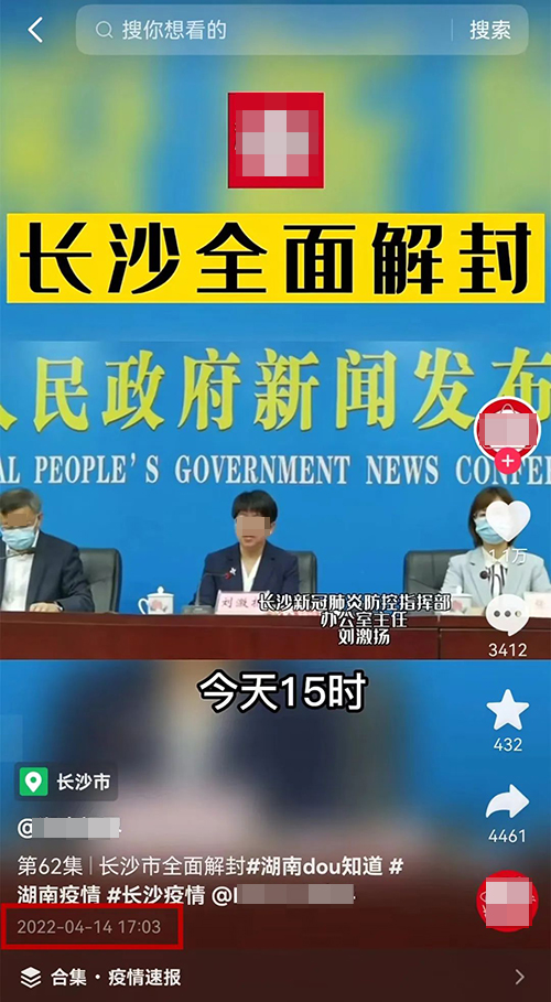 12月5日,微信群流传新闻发布会视频称:“今天15时,长沙市所有封控区、管控区、防范区全部解封”。经核实,这是今年4月14日,长沙市新冠肺炎疫情防控新闻发布会通报的情况。