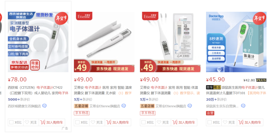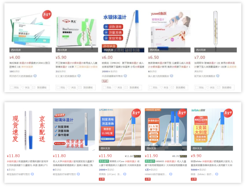 京东上,水银体温计价格从几元到10元左右不等,不过近期大量出现缺货现象。而电子温度计价格则高达数十元,是水银温度计的5-10倍。