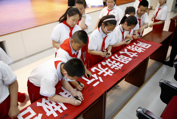 活动中,同学们纷纷来到印有“网络文明我先行 争做合格网络小公民”的宣传横幅上签名践诺。