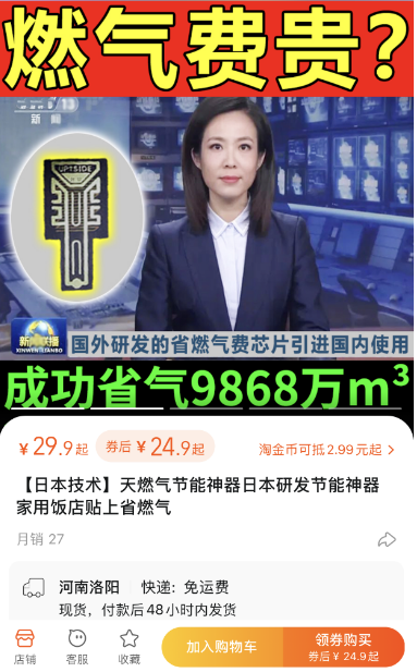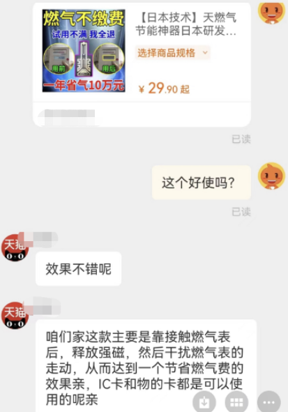 事实上,类似这样的“节能神器”在购物网站或短视频平台上并不鲜见。以“省水神器”“省燃气神器”等作为关键词进行搜索,能发现大量类似商品在售。有些商品的销售页面标注着“燃气免费用 贴上十年不交费”“燃气节能贴 每月燃气1元钱”等字样,有些则写明了“水表一贴不转 贴上立省钱”“无需插电 一贴即用”等,其中不少商品的月销量在二三百单以上。其中一家店铺销售的一款号称日本研发的“天然气节能神器”,客服人员明确表示,这款产品是通过释放强磁,干扰燃气表的走动,从而达到节省燃气的效果。