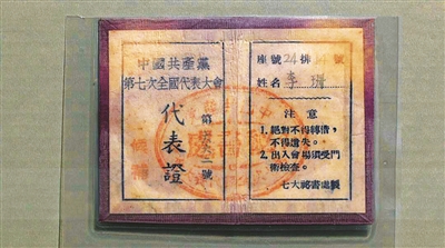 李珊参加中国共产党第七次全国代表大会的代表证。