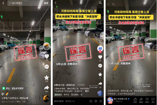 6月16日,网络平台账号“85660888.”发布视频称“小区地下车库进水”,网络平台账号“极小光与新小闻”“黑龙江台一起玩栏目”“我爱养鱼人”“幸福蜻蜓3”“孤勇者”“用户5201769212101”等使用该视频并称“6月16日,河南郑州,积水冲进地下车库”。