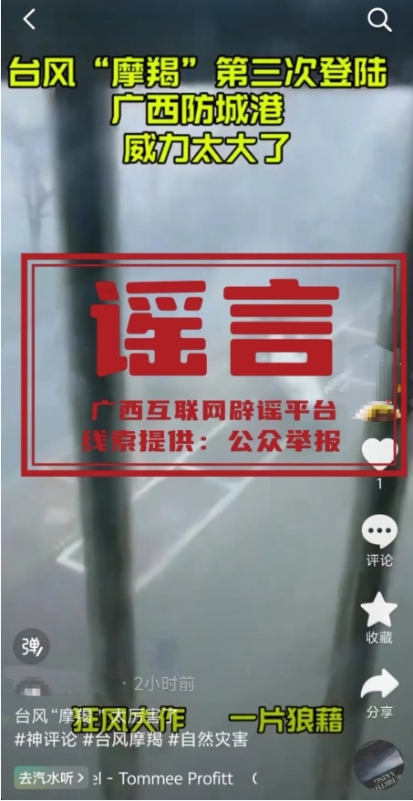经广西互联网辟谣平台核实,部分网民借“摩羯”话题,通过嫁接拼接等方式,将其他地方发生的狂风暴雨、洪水内涝等视频、图片标注为广西部分城市,发布涉台风网络谣言,试图借此博取流量。