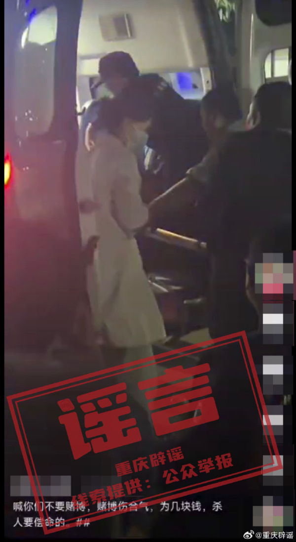 近日,黔江网民李某某发布有人被抬入救护车的视频,并配文“喊你们不要赌博,赌博伤和气,为几块钱,杀人要偿命”,引发关注。经核实,网传信息系谣言。