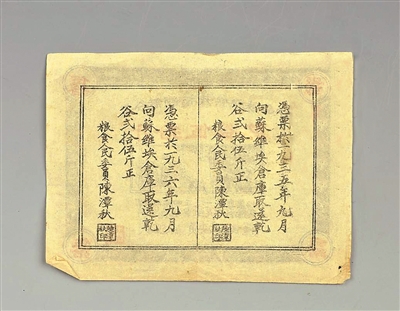 中华苏维埃共和国借谷票(背面)。瑞金中央革命根据地纪念馆供图