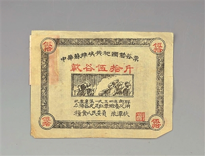 瑞金中央革命根据地纪念馆收藏有一张1934年中华苏维埃共和国借谷票,为毛边纸质,双色双面石印版,横9.8厘米、纵7.5厘米,保存基本完整。正面花边框内印有“中华苏维埃共和国借谷票干谷五十斤”的文字,“工农群众挑谷支援红军”的漫画图案,“此票专为一九三四年向群众借谷充足红军给养之用”的借谷说明,“粮食人民委员陈潭秋”的落款,并加盖陈潭秋方印。背面双线框分为两部分,分别印有“凭票于一九三五年九月向苏维埃仓库取还干谷二十五斤正”“凭票于一九三六年九月向苏维埃仓库取还干谷二十五斤正”字样。该文字表明:此50斤借谷票分两年还清,每年25斤。借谷票背面两部分同样有“粮食人民委员陈潭秋”的落款,并加盖陈潭秋方印。