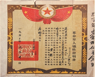 1952年秋,蒋宗英的父亲蒋翰平收到了中国人民志愿军司令部、政治部颁发的《革命军人牺牲证明书》,编号为068537号。