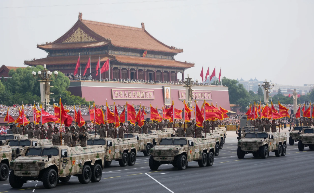 2025年9月3日,纪念中国人民抗日战争暨世界反法西斯战争胜利80周年大会在北京隆重举行。这是一次历史的回望,更是一次精神的传承。“狼牙山五壮士”、“平型关大战突击连”、“杨靖宇支队”、“刘老庄连”、“白刃格斗英雄连”……我国首次在阅兵中以80面抗战英模部队荣誉旗帜组成战旗方队受阅。80面用热血和生命铸就的功勋荣誉战旗,镌刻着忠诚与信仰,矗立起精神丰碑。图为战旗方队接受检阅。 新华社记者 王建华/摄