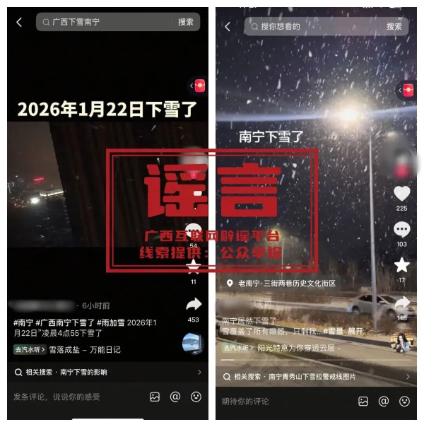广西气象台首席预报员在接受记者采访时明确表示,经核查,南宁市区气象站点并未观测到降雪,且1月22日前后几日,市区最低气温均在0℃以上,不具备降雪条件。此外,摄影专业人士指出,视频里的“雪”,大概率是飘雨时借助灯光照射搭配慢速快门营造出的视觉效果;而那些画面精美的雪景图,基本可以判定为未标注来源的AI生成图片。