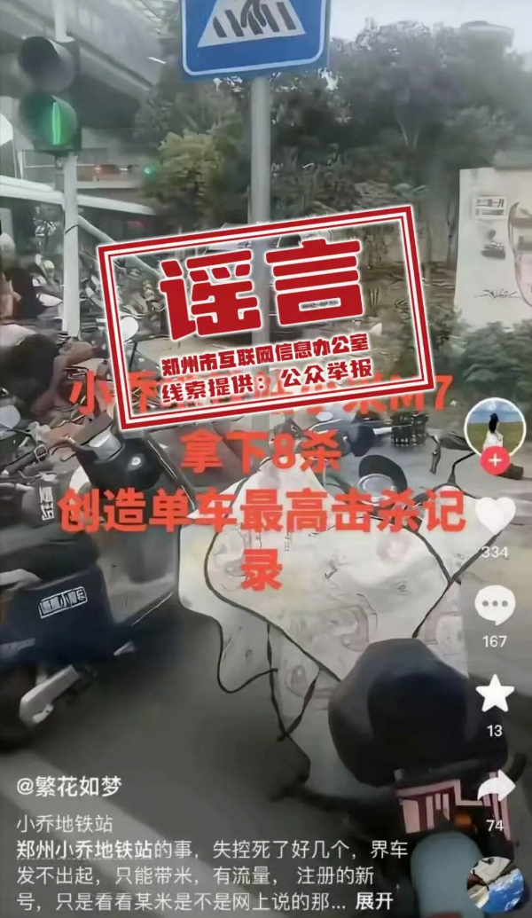 真相:11月5日,网络账号“繁花如梦”发布图文信息宣称“小乔地铁站某品牌汽车拿下8杀,创造单车最高击杀记录”,引发网民关注和讨论。经新郑市相关部门核实,该信息系不实信息。目前,公安部门已依法对信息发布者处以行政处罚。(来源:郑州市委网信办)
