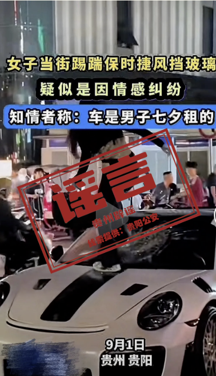 今年9月,贵阳警方在网络巡查中发现,一条所谓“情侣吵架损坏豪车”的视频获得大量关注,视频中的女子貌似在“抓小三”时怒踩保时捷挡风玻璃,此事引起网民热议。