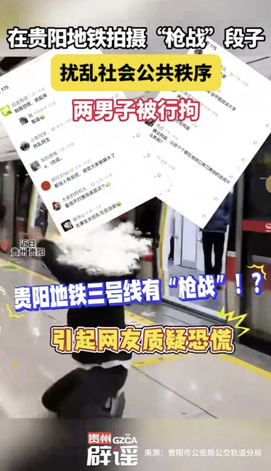 今年1月,某平台用户“小阿伟”、“小拿抓”发布一段视频,内容系在贵阳市地铁三号线上拍摄的手拿仿真枪,并配上“枪战”电影录音的视频,引发网友热议。