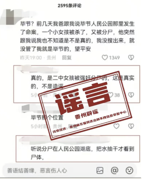 贵州辟谣在此提醒:网络不是法外之地,在网上发布信息应遵守法律规定,对于在互联网上编造、散布虚假信息、扰乱社会秩序的行为,有关部门将坚决依法处理,对于造成恶劣影响、情节严重的,将依法追究其法律责任,请广大网民不造谣、不信谣、不传谣,共筑清朗网络空间!