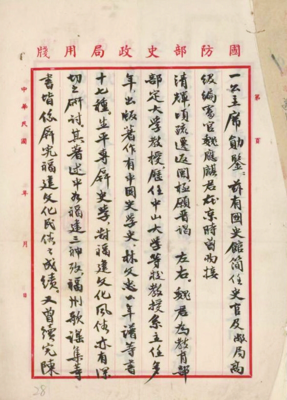 1949年2月,出任福州绥靖公署副主任的吴石为举荐史学专家魏应麒给主任朱绍良的函。(福建省档案馆藏)