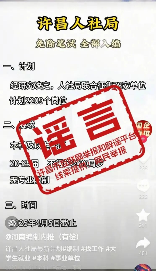 针对网传“许昌人社局免除笔试,全部入编”的谣言,许昌市委网信办向市人社局核查为不实信息后,发布辟谣信息,强调事业单位招聘流程的规范性和严肃性,提醒求职者警惕虚假招聘信息,通过正规渠道获取报考资讯。