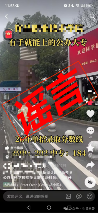 案例一:3月20日,东城分局查处一起网络谣言案件。网民张某为博取关注、吸引流量,编造发布许昌某高校2026年单招录取分数线信息。公安机关依法对张某作出行政处罚,并关停相关网络账号。