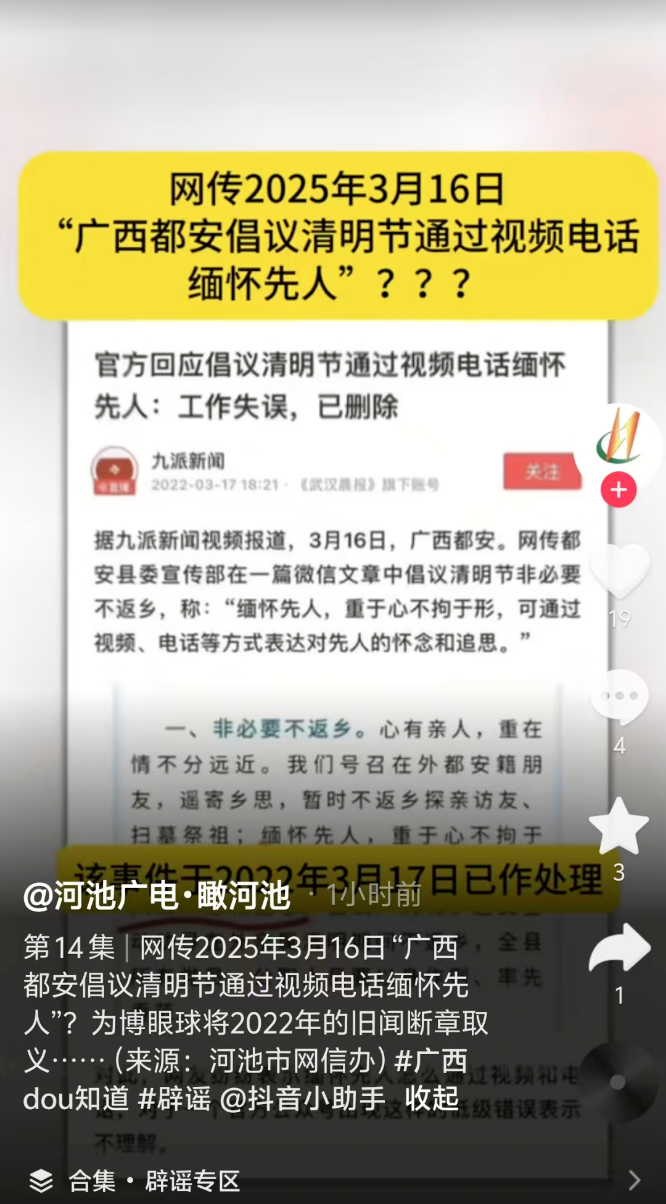 “广西某地倡议清明节视频缅怀先人”?别再翻炒2022年旧闻来造谣了!