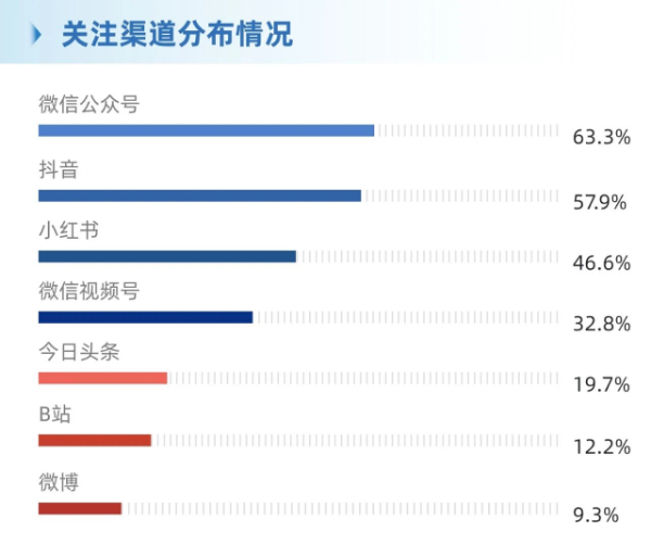 整体占比:微信公众号(63.3%)、抖音(57.9%)占据主导,小红书、微信视频号、今日头条次之,B站(12.2%)、微博(9.3%)占比较低。